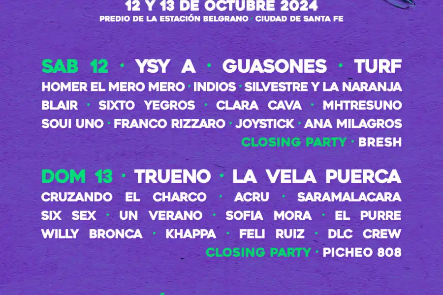 Dos días a pura música y todos los géneros, pasando desde el rey del trap y dueño de los sismos YSY A, nuestros vecinos uruguayos La Vela Puerca, uno de los líderes del rap nacional Trueno hasta el príncipe de los hits Turf y los platenses Guasones y Cruzando el Charco. El ansiado regreso a los escenarios de Indios, más referentes de la escena urbana como Acru, Saramalacara y Homer el Mero Mero también forman parte de esta entrega del festival.