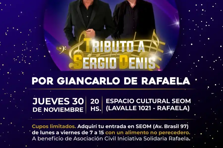 La Fundación SEOM convoca al evento que tendrá lugar este jueves 30/11 a las 20 horas en el Espacio Cultural SEOM. En esta ocasión, se trata de un espectáculo musical a cargo del intérprete Giancarlo de Rafaela, quien presentará su tributo en homenaje al querido artista Sergio Denis.