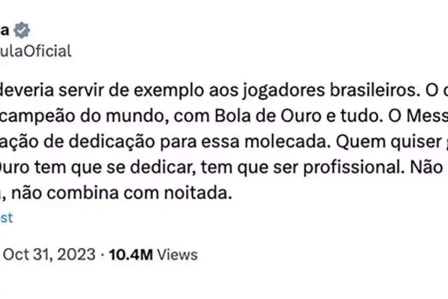 Quien se refirió de forma indirecta a Neymar fue el presidente de Brasil, Lula da Silva, que hizo un comentario en medio de su elogio a Lionel Messi por ganar su octavo Balón de Oro: “Messi debería servir de ejemplo a los jugadores brasileños. El chico de 36 años, campeón del mundo, con el Balón de Oro y todo. Messi necesita ser una inspiración de dedicación para estos niños. Quien quiera ganar el Balón de Oro tiene que dedicarse, tiene que ser profesional. No va con la fiesta, no va con la noche de fiesta”. En tanto que en sus intervenciones vía redes sociales el primer mandatario preguntó: “¿Hace cuántos años que Brasil no tiene un ídolo de verdad?”. Infobae.