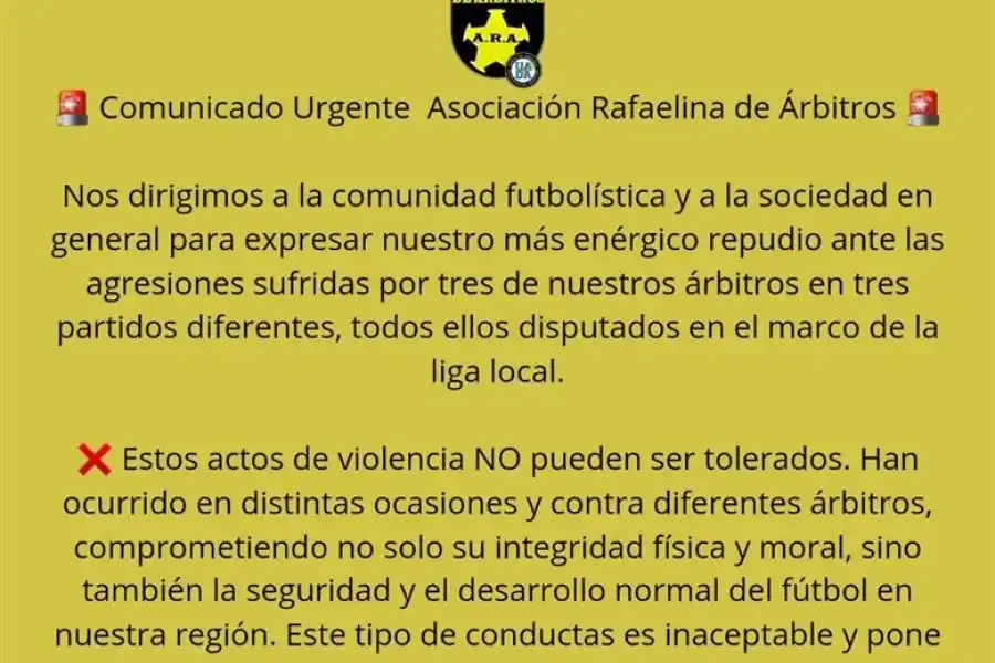 El comunicado de la Asociación Rafaelina de Árbitros