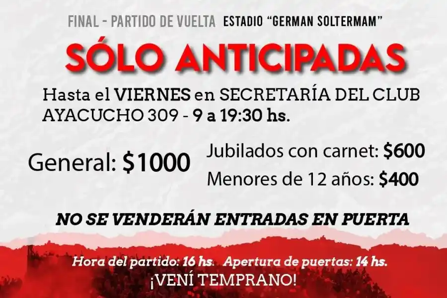 Desde la institución juliense dieron a conocer información sobre la venta de entradas. Las anticipadas se podrán adquirir hasta el día viernes en la secretaría del club, ubicada en calle Ayacucho 309. El horario de atención es de 09.00 a 19.30 horas.