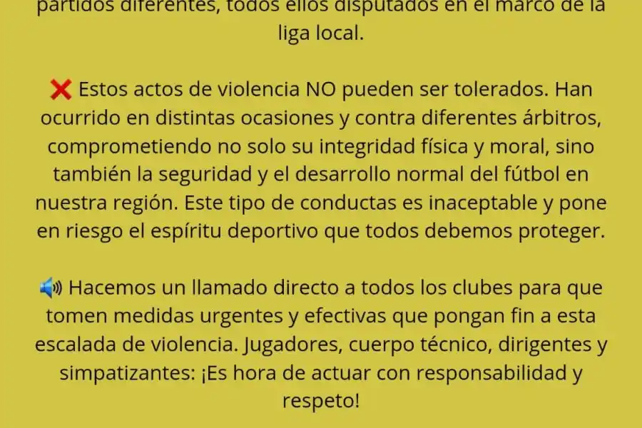 “Nos dirigimos a la comunidad futbolística y a la sociedad en general para expresar nuestro más enérgico repudio ante las agresiones sufridas por tres de nuestros árbitros en tres partidos diferentes, todos ellos disputados en el marco de la liga local”, comienza el mensaje.