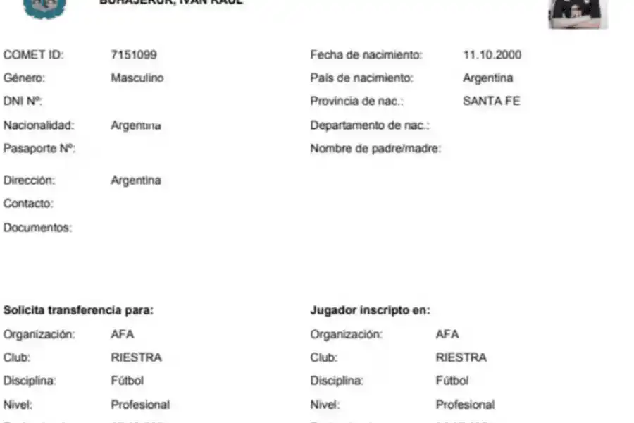 Allí, se lo ve vistiendo la camiseta del Deportivo Riestra, acompañado de su nombre de pila y apodo, junto al número 47 y otros datos relevantes como su año de nacimiento, edad, nacionalidad, la posición en la que juega y su pierna hábil.
