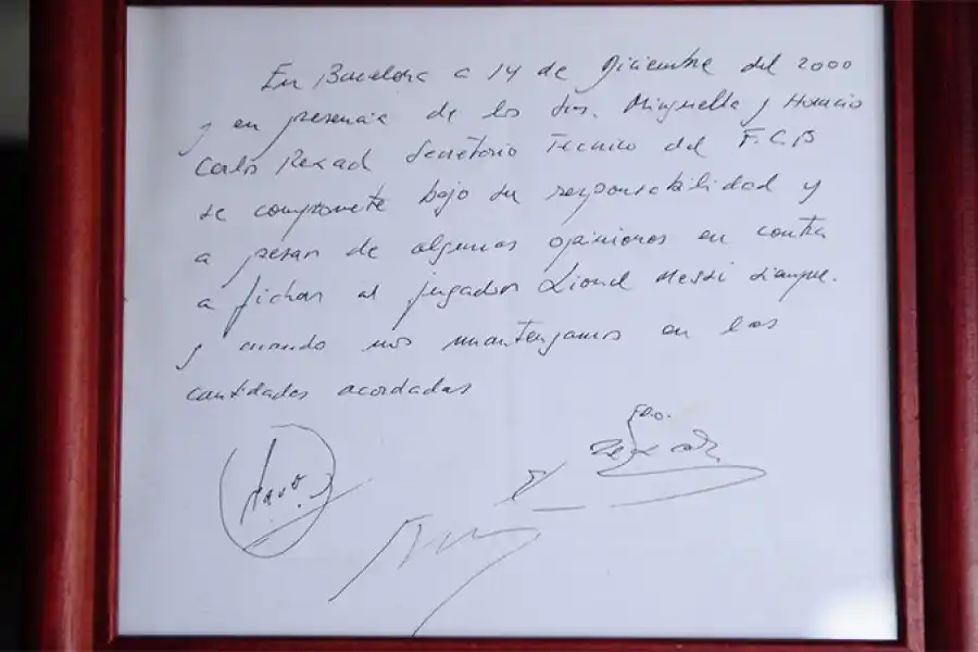 Aquel trozo de papel, que data de diciembre del 2000, cuando Messi tenía apenas trece años, fue el compromiso de un contrato con el Barcelona y está firmada la lapicera azul por Carles Rexach, entonces director deportivo de los Blaugrana.