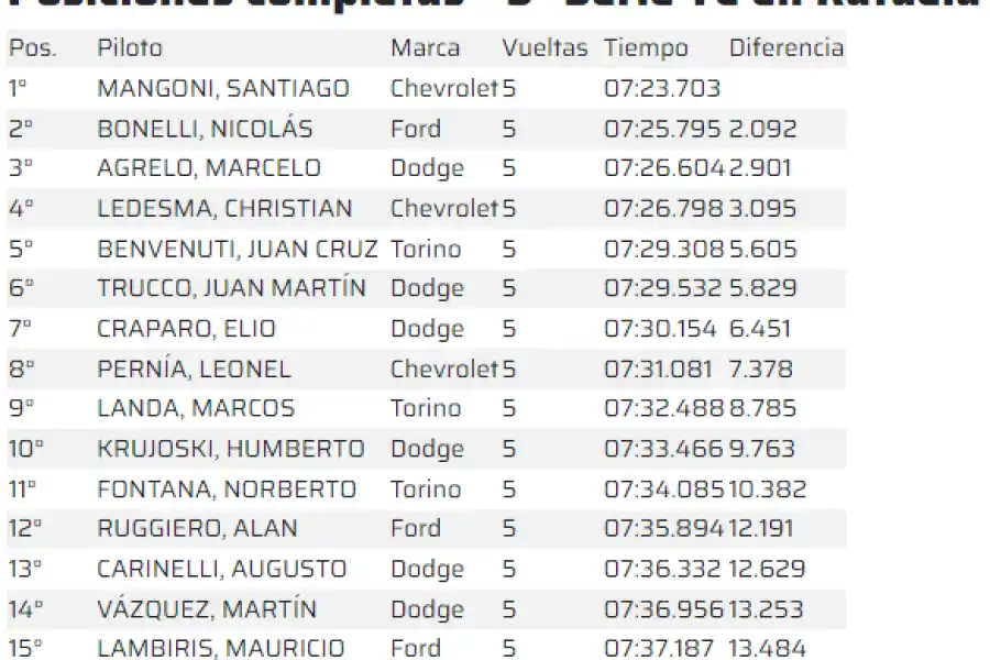 Se puso en marcha la última serie del Turismo Carretera en Rafaela con Mangoni en la primera posición, escoltado por Nicolás Bonelli. Mientras que Trucco se ubicó tercero luego de dejar atrás a Lambiris. Este último, se retrasó con el Ford metros después el flamante cuarto era Agrelo y quinto Ledesma.