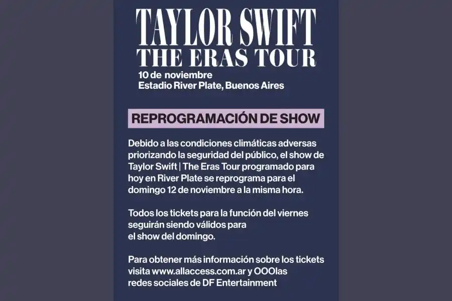 Minutos después de esa comunicación, Taylo Swift lo dió a conocer desde su cuenta oficial de X en la que tiene casi 95M de seguidores, "Me encanta un espectáculo bajo la lluvia, pero nunca voy a poner en peligro a mis fans ni a mis compañeros artistas y equipo. Hemos reprogramado el espectáculo de esta noche en Buenos Aires para el domingo debido a que el clima es tan caótico que sería inseguro intentar realizar este concierto. ¡¡La buena noticia es que podré quedarme más tiempo en Argentina!!"