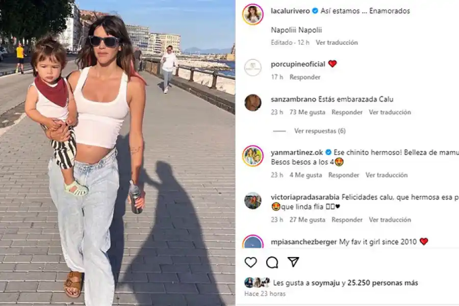 A una semana de que se confirmara que Calu Rivero está embarazada, la actriz mostró su pancita en Nápoles, ciudad italiana que está recorriendo con Aíto de la Rúa y su hijo, Tao, de un año.