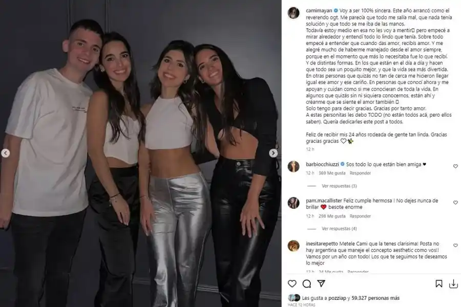 “Voy a ser 100 % sincera. Este año arrancó como el reverendo ogt. Me parecía que todo me salía mal, que nada tenía solución y que todo se me iba de las manos. Todavía estoy medio en esa, no les voy a mentir, pero empecé a mirar alrededor y entendí todo lo lindo que tenía. Sobre todo empecé a entender que cuando das amor, recibís amor. Y me alegré mucho de haberme manejado desde el amor siempre, porque en el momento que más lo necesitaba fue lo que recibí. Y de distintas formas”, escribió en un posteo sobre su fiesta de cumpleaños.