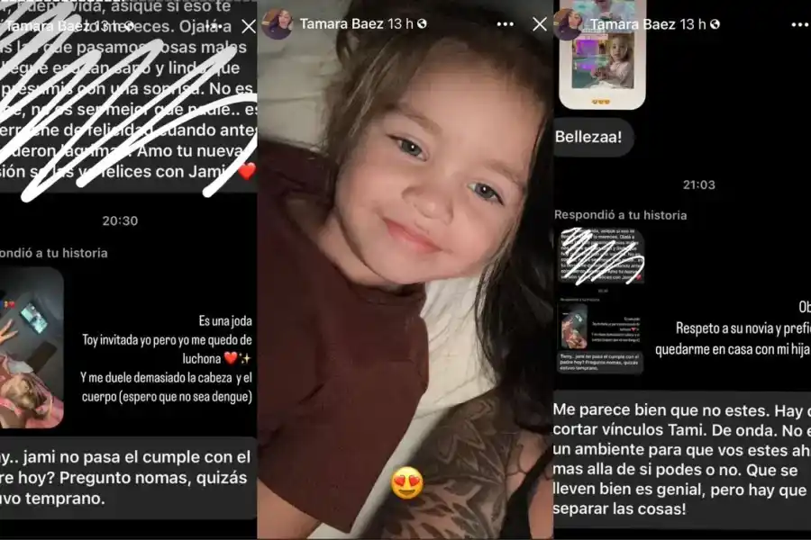 En tanto, también desde sus historias virtuales, su ex Tamara Báez se mostró en la intimidad de su casa junto ala pequeña Jamaica. Y ante la consulta de un usuario sobre si no llevaba a la nena al cumpleaños de su papá, Tamy explicó: "Toy invitada, pero yo me quedo de luchona. Me duele demasiado la cabeza y el cuerpo (espero que no sea dengue)".