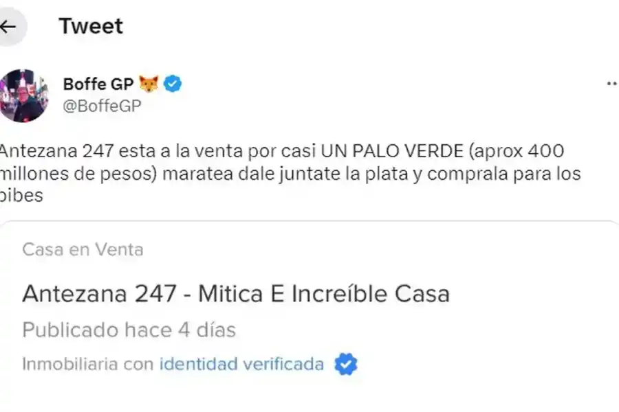 El usuario de Twitter @BoffeGP compartió la publicación de la casa en venta, pero lo verdaderamente llamativo no fue simplemente verla en el mercado, sino el increíble precio que se requiere para adquirirla. Con aproximadamente 400 metros cuadrados, cinco dormitorios, dos baños y una cochera, su valor asciende a 850.000 dólares, equivalente a unos 400 millones de pesos argentinos.