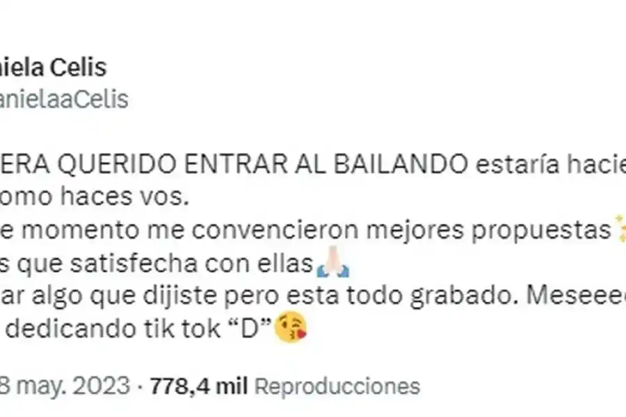 Y agregó punzante: "Si quiere entrar al 'Bailando' colgándose de los demás, no le voy a dar ese privilegio, que se lo gane ella solita, no colgándose del resto", después de que Celis disparase contra ella en Mañanísima (Ciudad Magazine).