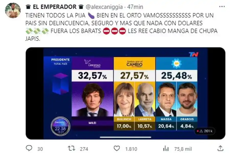 “Yo quiero ser respetuosa y respetar el voto de cada ciudadano, pero cómo vas a votar a Milei la conch... de la lora”, escribió la actriz Dalia Gutman en su cuenta de Twitter. En la misma línea, Lali Espósito tuiteó: “Qué peligroso. Qué triste”.