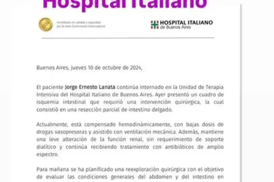 En el escrito, que fue compartido por la esposa del comunicador, Elba Marcovecchio, afirmaron que Lanata “continúa internado en la Unidad de Terapia Intensiva” y agregaron que el procedimiento quirúrgico, “consistió en una resección parcial del intestino delgado”.
