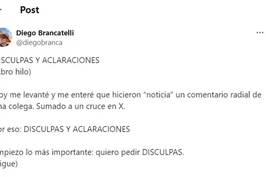 Entonces el periodista decidió dar un paso al costado en la pelea y publicó un comunicado titulado "Disculpas y aclaraciones": "Hoy me levanté y me enteré que hicieron 'noticia' un comentario radial de una colega. Sumado a un cruce en X. Por eso: DISCULPAS Y ACLARACIONES. Empiezo lo más importante: quiero pedir DISCULPAS. 1ro a Cecilia. Por meterme e indirectamente a ella en el barro de X. Agrediendo. Diciendo cosas feas. Pese a que me aconseja siempre que largue la cloaca que es esta red. Que disfrute la familia. Las cosas hermosas que tenemos. Siempre aconsejando para ser mejor persona. Como lo es ella".
