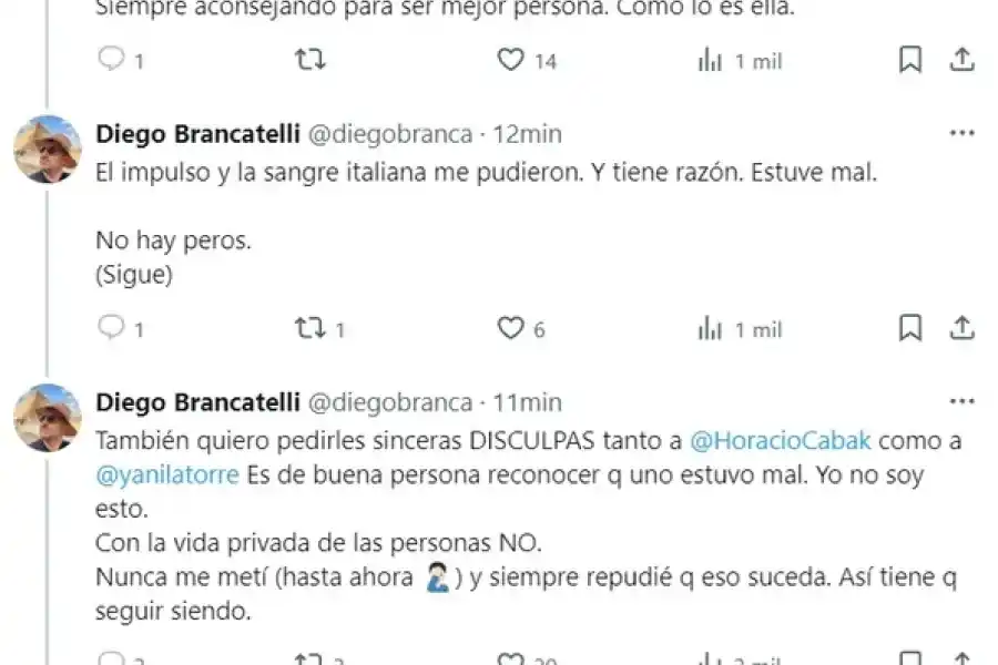 "El impulso y la sangre italiana me pudieron. Y tiene razón. Estuve mal. No hay peros. También quiero pedirles sinceras DISCULPAS tanto a Horacio Cabak como a Yanina Latorre. Es de buena persona reconocer que uno estuvo mal. Yo no soy esto. Con la vida privada de las personas NO. Nunca me metí (hasta ahora) y siempre repudié que eso suceda. Así tiene que seguir siendo", continuó.