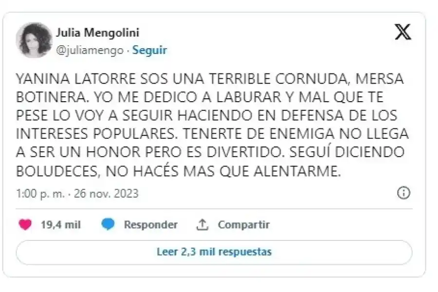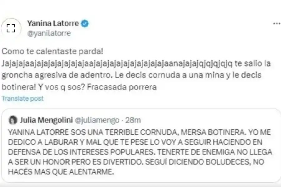 La respuesta de Mengolini no se hizo esperar: "Yanina Latorre sos una terrible cornuda, mersa botinera. Yo me dedico a laburar y mal que te pese lo voy a seguir haciendo en defensa de los intereses populares. Tenerte de enemiga no llega a ser un honor, pero es divertido. Seguí diciendo boludeces, no hacés más que alentarme”.