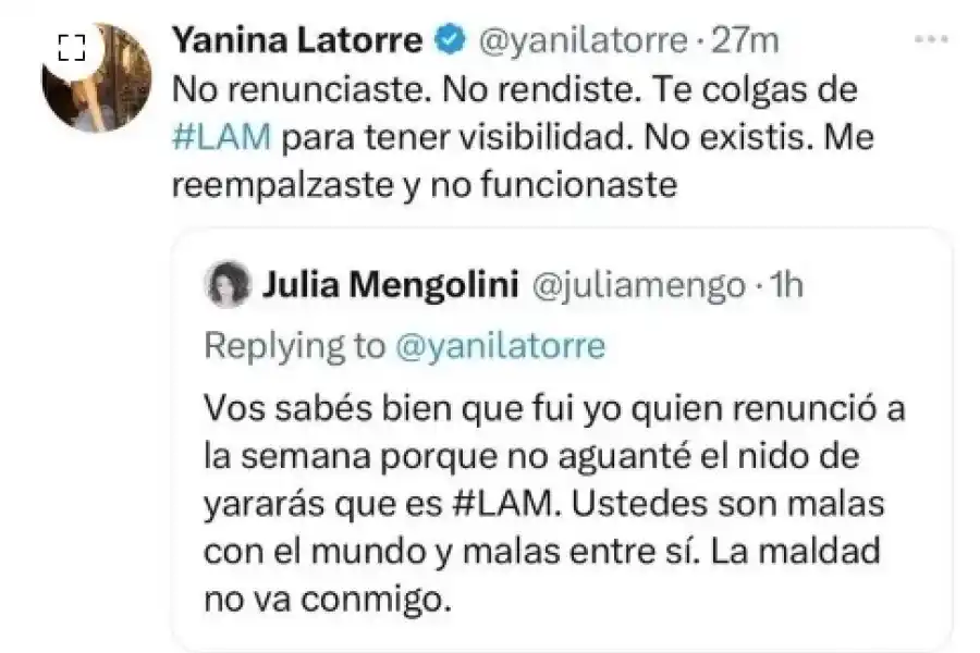Latorre recordó cuando Julia estuvo en LAM: "Fuiste mi reemplazo en la corpo, pero no funcionaste inútil, solo vivís del Estado”, pero su colega aseguró que fue ella quien renunció: "Vos sabés bien que fui yo quien renunció a la semana porque no aguanté el nido de yararás que es #LAM. Ustedes son malas con el mundo y malas entre sí. La maldad no va conmigo".