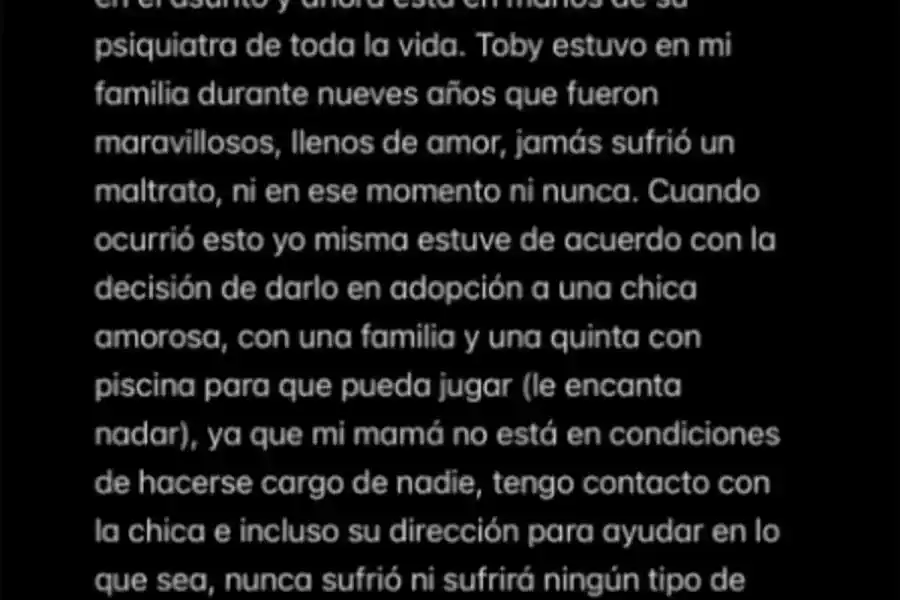Priscilla contó que el perrito estuvo en la familia durante 9 años, pero luego fue llevado a otro hogar. "Toby estuvo en mi familia durante nueve años que fueron maravillosos, llenos de amor, jamás sufrió un maltrato, ni en ese momento ni nunca. Cuando ocurrió esto yo misma estuve de acuerdo con la decisión de darlo en adopción a una chica amorosa, con una familia y una quinta con piscina para que pueda jugar (le encanta nadar), ya que mi mamá no está en condiciones de hacerse cargo de nadie”, detalló.