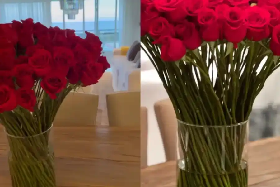 La modelo y conductora de MasterChef compartió en las stories de sus redes un enorme ramo de veintisiete rosas rojas que le envió su marido, un gesto en modo de festejó por el aniversario y lo lució en el living de su casa.