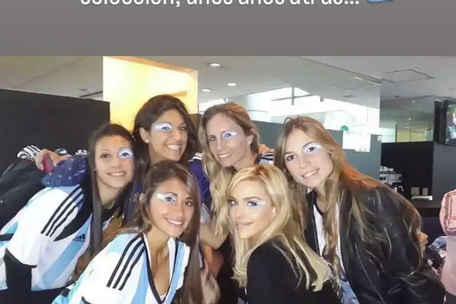 “Esperando el partido de la Selección, unos años atrás”, expresó la bailarina junto a una postal de Brasil 2014, el último Mundial que jugó su esposo. Allí aparecen con las camisetas albicelestes y uno de los ojos pintados a tono.