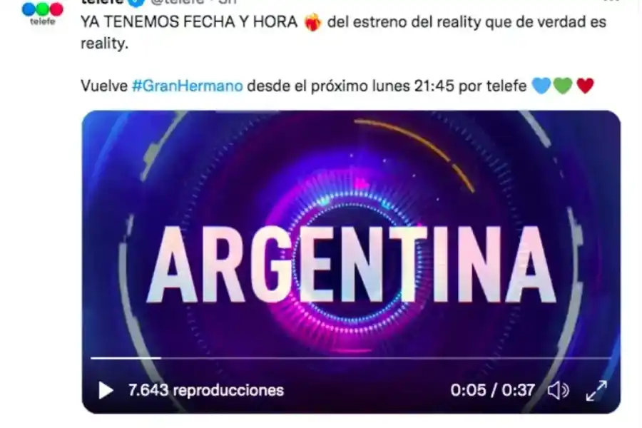 "YA TENEMOS FECHA Y HORA del estreno del reality que de verdad es reality. Vuelve Gran Hermano desde el próximo lunes 21:45 por telefe", anunció el canal de las pelotas en sus redes sociales.