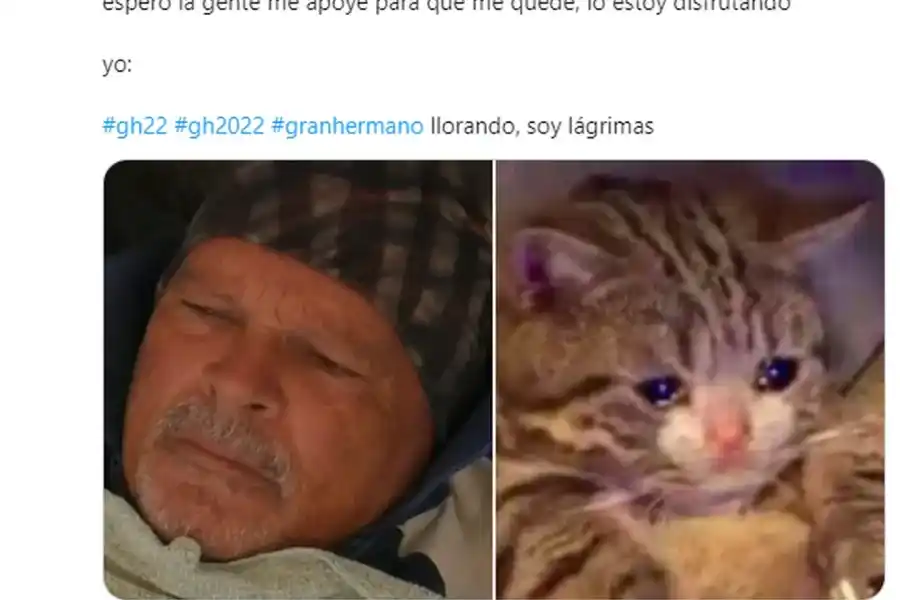 Por otra parte, no faltaron los que compararon al integrante de Gran Hermano con un gatito llorón: “Alfa: extraño a mi hija, quiero seguir hasta el final intentando hacerlo bien, espero que la gente me apoye para que me quede, lo estoy disfrutando. Yo: llorando, soy lágrimas”, bromeó un joven con el video más emocionante del reality.
