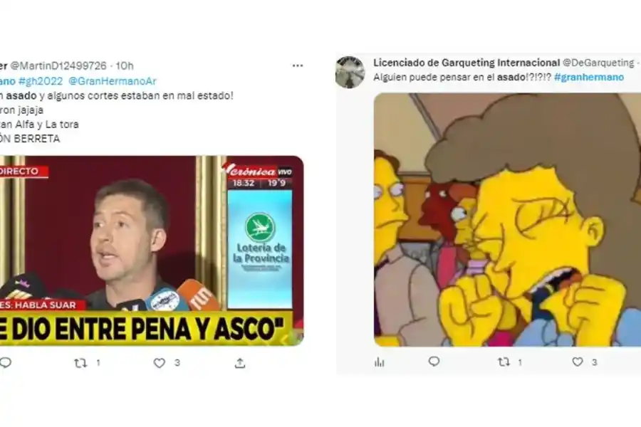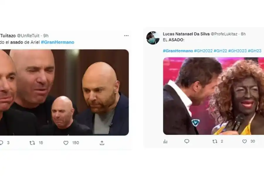 “Mirá lo que es ese asado, tienen que expulsarlos a todos y que se termine esta edición”; “Le mandaron asado y algunos cortes estaban en mal estado. Los devolvieron, según cuenta Alfa y La Tora. Producción berreta”; “Creo que queda así cuando le echan salmuera a la carne mientras se cocina”; “El asado parece las islas de Santa Fe”; “Creo que el carbón va abajo de la parrilla, pero como no soy asador no opino”; “¿Ese es el vacío de la parrilla de Ariel?”; “Ni uno sabe hacer un asado, rajen a todos”, fueron algunos de los comentarios más despiadados en la red social del pajarito.