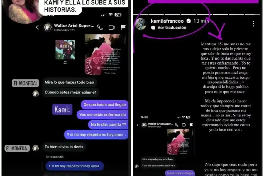 En otras de las capturas que compartieron en la misma página, Kami expresó: “Mentiras. Si me amás no me vas a dejar sola. Lo primero que sale de tu boca es que estoy loca. Y no te das cuenta de que me estás enfermando. Yo te quiero mucho. Pero no puedo ponerme mal porque tengo una hija que me necesita, tengo responsabilidades”.