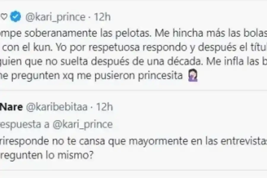 Activa en Twitter, la cantante interactuó con sus seguidores, a través de un ida de preguntas y respuestas, y aprovechó la consulta de un usuario para subrayar que está cansada de que le pregunten por el Kun y por el origen de su apodo, Princesita.