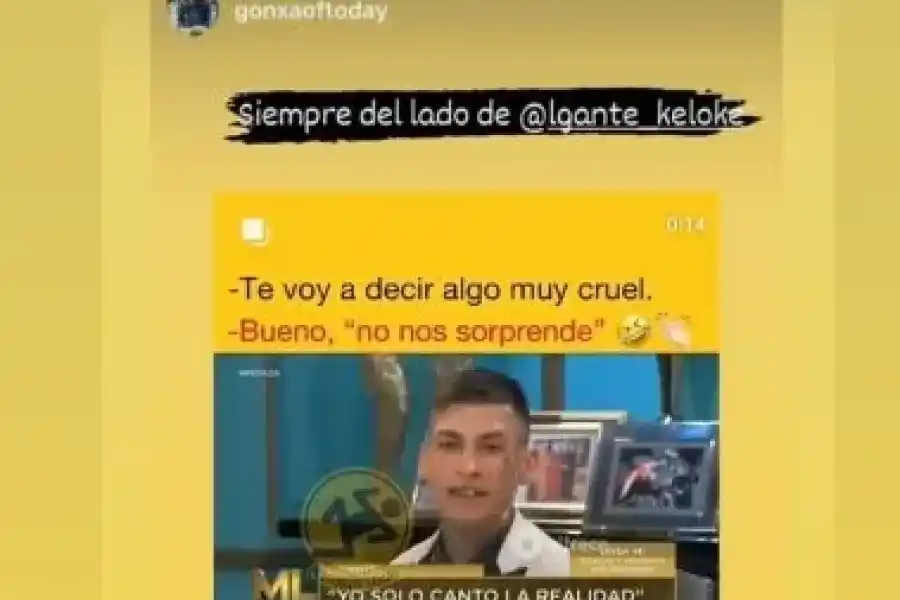 "Vos me caís bien y ya no me caes tan bien, porque cuando te dije el nombre de mi hija dijiste: 'Pobrecita'. Esos chistes no me gustan"[L-Gante]