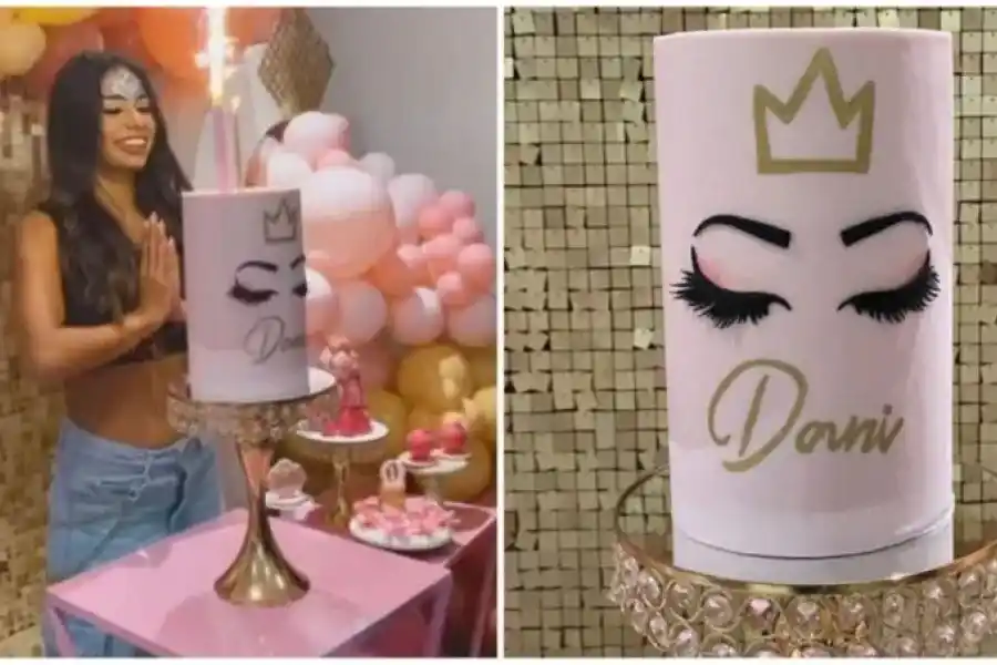 La torta, con la forma de un cilindro de gran altura, llevaba escrito "Dani" en su frente, mientras que poco más arriba se situaban dos ojos con enormes pestañas, que hacía referencia al apodo de "Pestañela" que la influencer se ganó en el programa de Telefé y que llamaron la atención de los usuarios, que indicaron que "obviamente la torta tenía pestañotas".