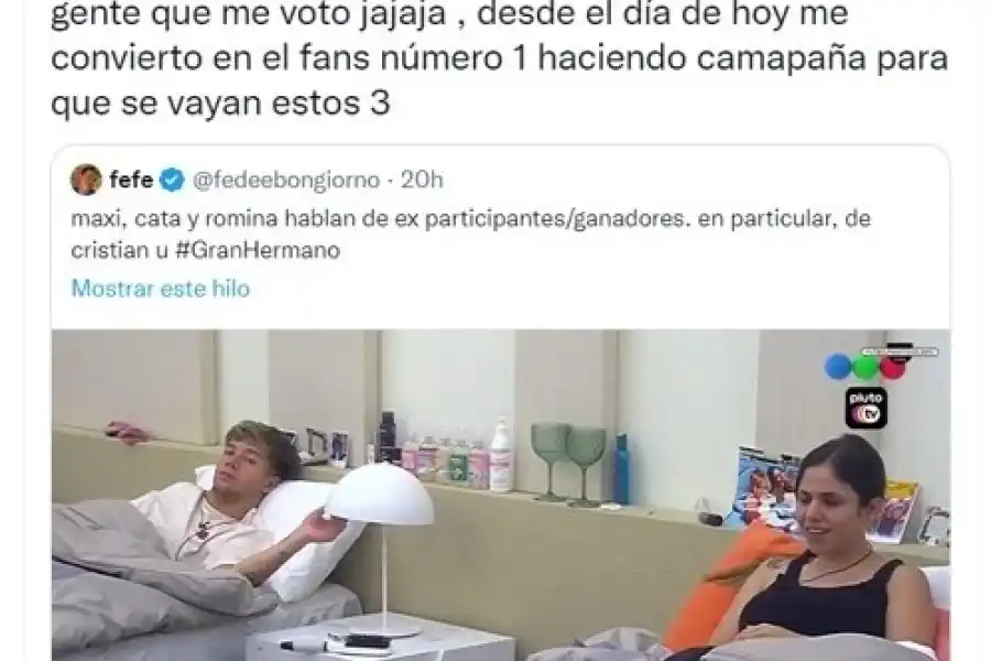 Cristian U subió a su cuenta de twitter el corte del video y les dejó un fuerte mensaje a todos, menos a María Laura, que ya había sido expulsada: "Estos tres desastres criticándome y descalificando a la gente que me votó... jajaja. Desde el día de hoy me convierto en el fan número uno haciendo campaña para que se vayan estos tres".