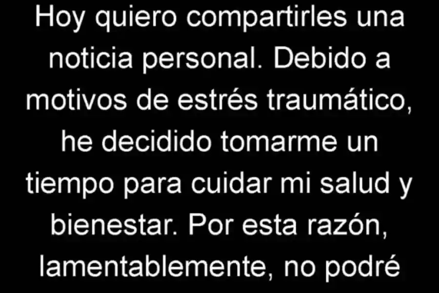 "Espero que todos estén bien. Hoy quiero compartirles una noticia personal. Debido a motivos de estrés traumático, he decidido tomarme un tiempo para cuidar mi salud y mi bienestar", empezó.
