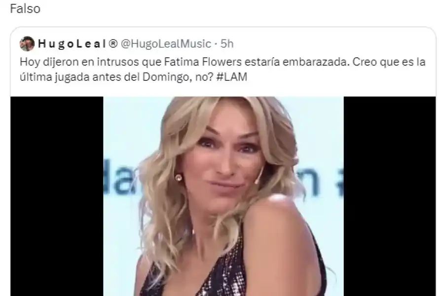 “Hoy dijeron en Intrusos que Fátima Flowers estaría embarazada. Creo que es la última jugada antes del Domingo”, escribió un usuario de X (ex Twitter). El conductor de LAM citó este posteo y fue contundente: “Falso”.