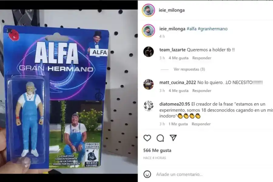 Ieie Milonga Herrera es el inventor de la réplica en juguete del participante Alfa de Gran Hermano 2022, que lloró al estar nominado para irse este domingo, se presentó en las redes sociales con el muñeco y el hashtag #alfa#granhermano y la foto del muñeco y estallaron sus seguidores.