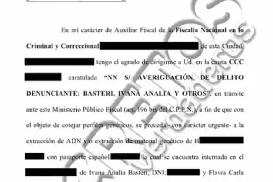 “La Fiscalía Nacional en lo Criminal y Correccional ordena que se proceda -con carácter urgente- a la extracción de ADN y/o material genético de la señora ‘H’, Ivana Analía Basteri y Flavia Carla Basteri”, expresa el texto, a la vez que aclara: “A los efectos de que se proceda a obtener un perfil genético de cada una de las nombradas para su posterior cotejo. Ello para establecer si estas últimas responden al mismo perfil genético de la primera mencionada”.