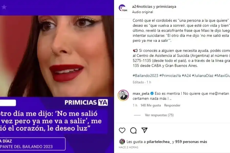 Juliana, muy conmovida, habló en la pista del Bailando 2023: “Algunas personas se piensan que todo esto es un circo, pero somos seres humanos y la verdad que si no hubiera estado yo, su amigo, su familia hubiera podido pasar cualquier cosa. No me importa si Maxi me odia, yo lo único que quiero es que él vuelva a sonreír, y que esté con vida, y que esté bien, se lo deseo de corazón. El otro día me dijo ‘no me salió esta vez, pero ya me va a salir. Me partió el corazón, le deseo luz”.