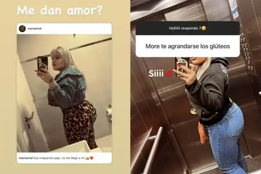 En las imágenes compartidas, se la ve a Morena de espaldas a un espejo, con una joggineta de animal print que resalta su recién lograda silueta. Así, en una caja de preguntas que abrió para interactuar con sus seguidores, uno de ellos se animó a preguntarle: “More, ¿te agrandaste los glúteos?”. Consisa pero evidenciando su felicidad con los resultados, ella respondió: “Siiii”, seguido de un emoji de besito.