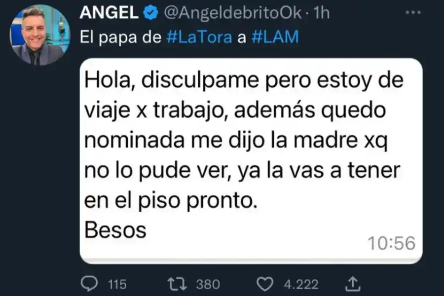 En las últimas horas, en Twitter, Ángel de Brito mostró una captura de una chat de la producción de LAM (América TV) con el papá de La Tora. El hombre fue invitado a programa, pero rechazó la propuesta.