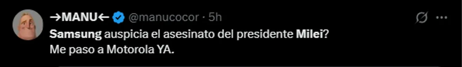 Cualquiera puede hacer cualquiera?. Los que lo tomaron con humor se refirieron al tema como: ”Sino sacan comunicado, compramos @Xiaomi o @Moto" o, "Samsung auspicia el asesinato del presidente Milei? Me paso a Motorola YA.