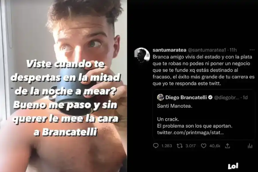 Lejos de dejarlo ahí, el joven continuó la guerra por Instagram y compartió la pelea con sus seguidores en esa plataforma: “¿Viste cuando te despertás en la mitad de la noche a mear? Bueno, me pasó y, sin querer, le meé la cara a Brancatelli”, escribió acompañando una selfie tomando un café.