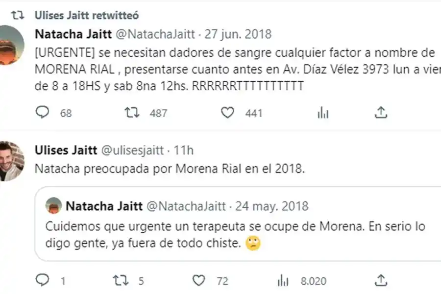 A su vez, el hermano de la fallecida modelo recordó tweets de ese mismo año donde Natacha pedía ayuda para Morena Rial. “Cuidemos que urgente un terapeuta se ocupe de Morena. En serio lo digo gente, ya fuera de todo chiste”, se lee en uno de los tweets. Mientras que en otro la mediática compartía información para que pudieran donar sangre para la joven.