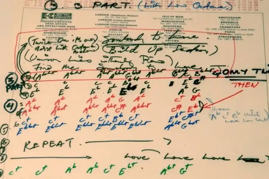 Entre los escritos destaca un borrador de 15 páginas escrito con bolígrafo y lápiz en hojas de una antigua aerolínea, British Midlands Airways, que revela los múltiples giros que Mercury consideró durante la composición del éxito "Bohemian Rhapsody".