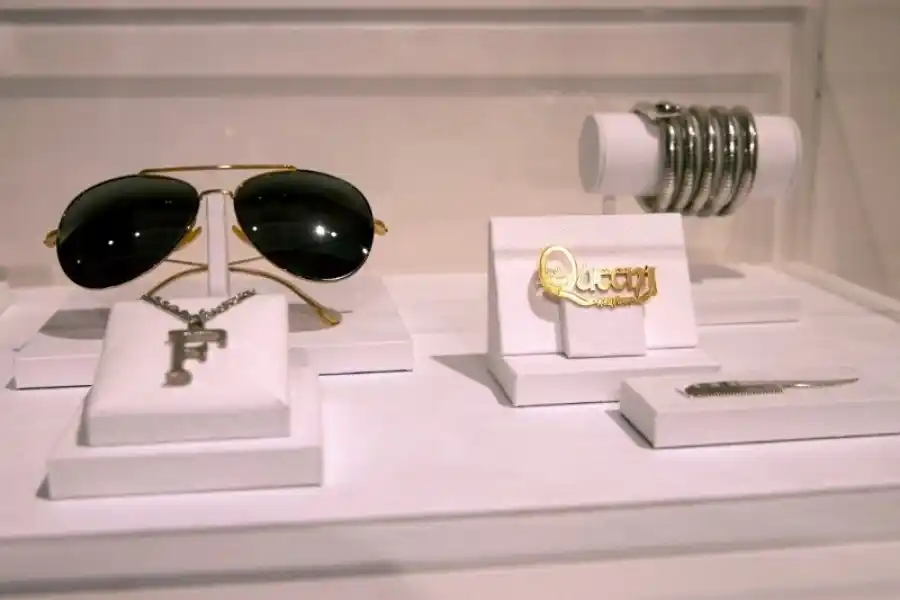 Entre los artículos se destacan: la corona que usó en el concierto de Wembley, unas zapatillas Adidas altas con manchas de la última vez que las llevó puestas, unas gafas de aviador, un brazalete con forma de serpiente y hasta un mini peine de 2 centímetros con el que se acomodaba el bigote.