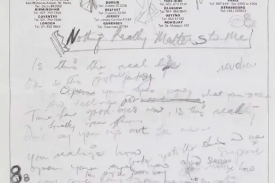 La colección tiene, también, un cuaderno rojo de notas de inicios de 1970 donde figuran sus primeras letras, así como bocetos del logo del grupo manchados con café.