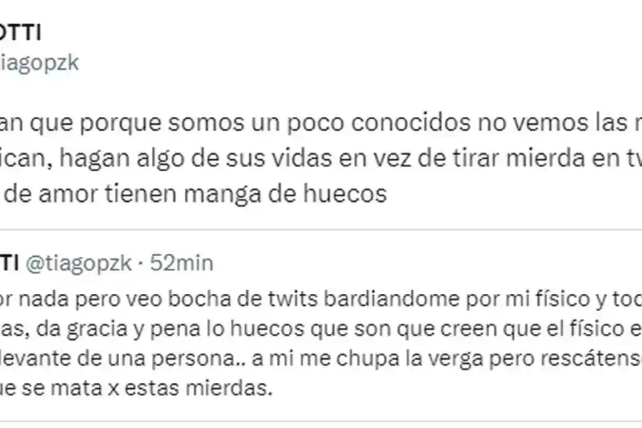 Horas después, el autor de “Entre nosotros” salió al cruce de los haters con un furioso descargo que compartió en sus redes sociales. “No es por nada, pero veo bocha de tuits baldeándome por mi físico y todos son de wachas”, expuso el artista, cuyo nombre real es Tiago Uriel Pacheco Lezcano.