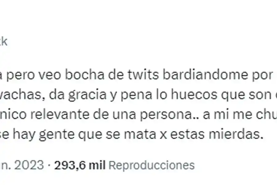 Por último, cerró el tema con otro durísimo tuit en el que fulminó a sus haters: “Se piensan que porque somos un poco conocidos no vemos las m... que publican. Hagan algo de sus vidas en vez de tirar m... en Twitter. Una falta de amor tienen, manga de huecos”.