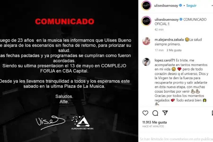 "Luego de 23 años en la música, les informamos que Ulises Bueno se alejará de los escenarios sin fecha de retorno para priorizar su salud", comenzó el comunicado.