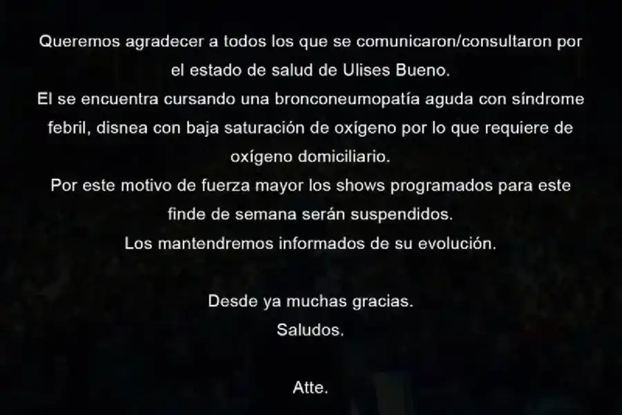 "Queremos agradecer a todos los que se comunicaron/consultaron por el estado de salud de Ulises Bueno. Él se encuentra cursando una bronconeumopatía aguda con síndrome febril, disnea con baja saturación de oxígeno", comienza diciendo el comunicado.