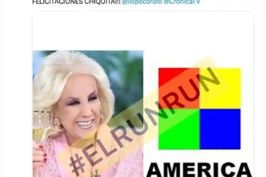 El conductor aseguró a través de su cuenta en Twitter que Mirtha ahora será parte del staff de América TV, estación que recientemente sumó también a Marcelo Tinelli: "¡Primicia! #ELRUNRUN @mirthalegrand ya es de @AmericaTV ¡FELICITACIONES CHIQUITA! @liopecoraro @CronicaTV".